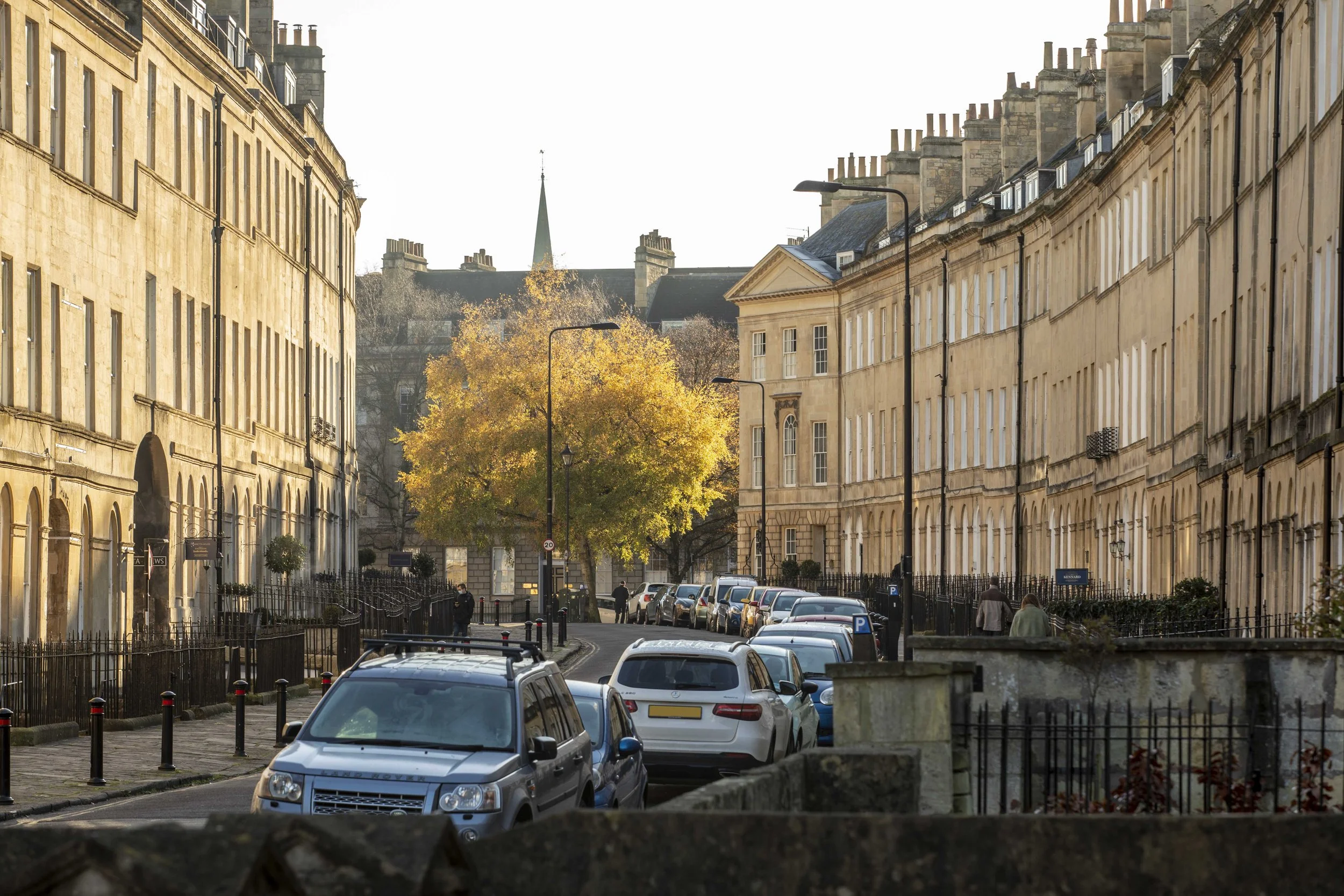 A street scene in a residential neighborhood with rows of beige buildings, parked cars, and a tree with yellow leaves.